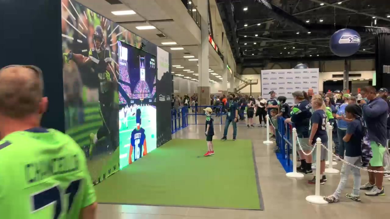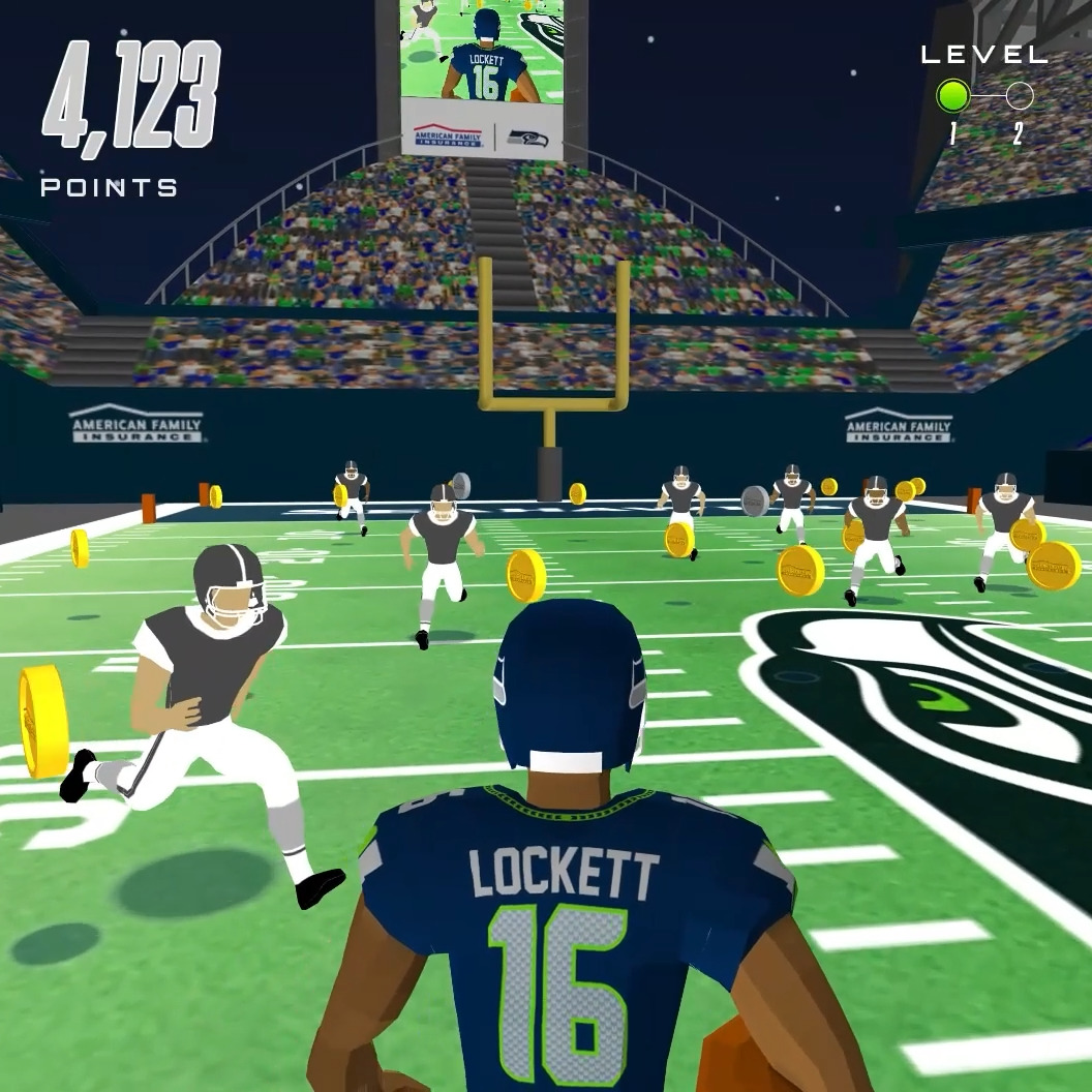 AFI has an ongoing presence at Lumen Field in Seattle. Hovercraft Studio worked with rEvolution to build a new gaming zone for Seahawks fans. I programmed a physical video game that let fans return a punt, playing as football star Tyler Lockett. By moving their bodies side-to-side, Tyler avoids defenders and picks up extra points while doing what he does best. This video game installation ran the duration of the 2021-22 football season.