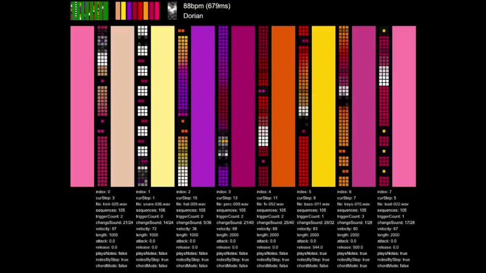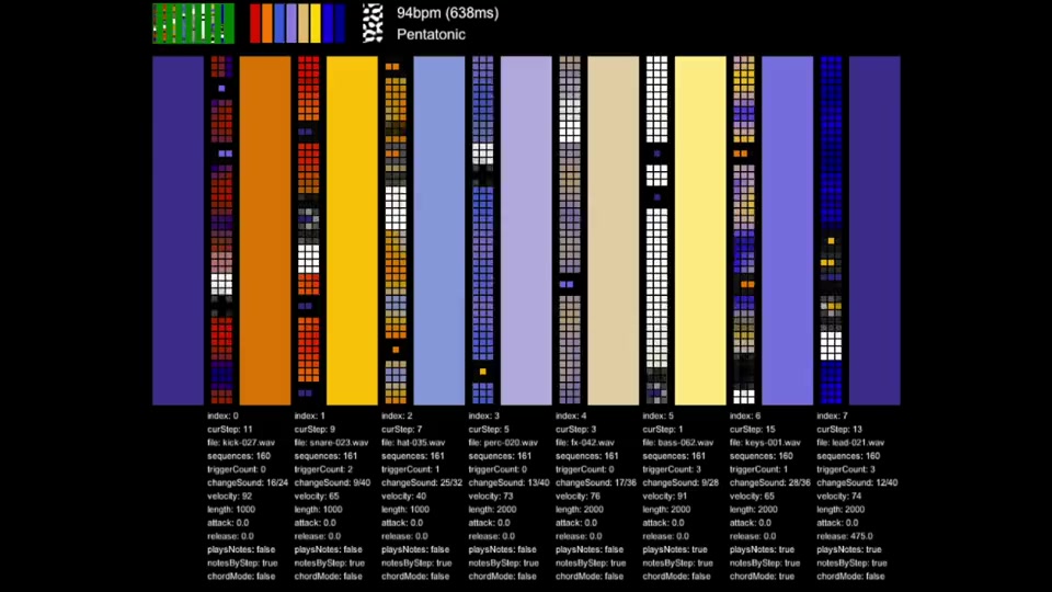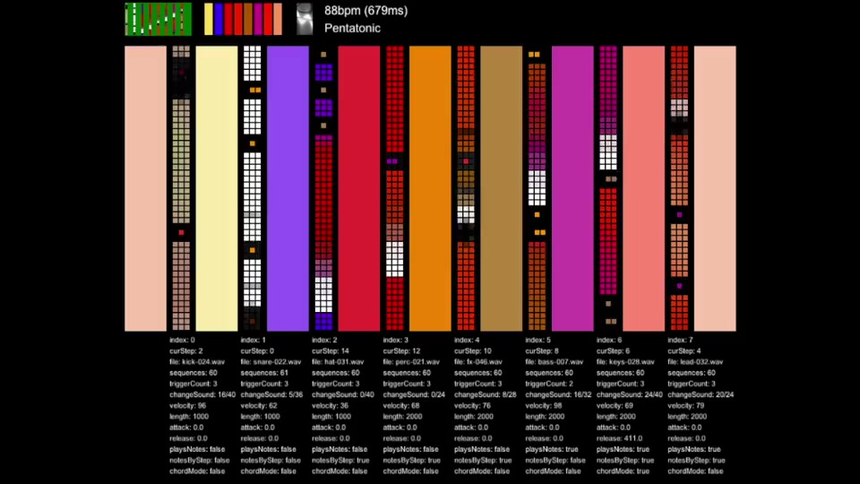 Interphase creates continually-evolving music, largely based on pattern generator algorithms that have been optimized per-instrument. The sound palette comes from a library of hand-selected and normalized audio samples, organized by instrument type: kick, snare, hihats, precussion, sound effects, bass, synth, lead. These audio samples were pulled from a few hours of Interphase running and evolving without any user interaction.