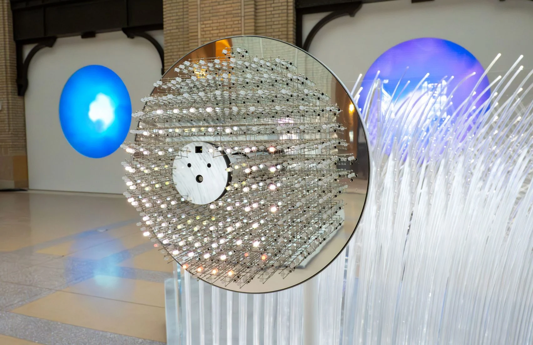 Powered by open-source artificial intelligence, the participatory artwork translates visitors’ individual visions for the future into unique kinetic light responses that get woven into three portals displaying our collective feeling for the future.