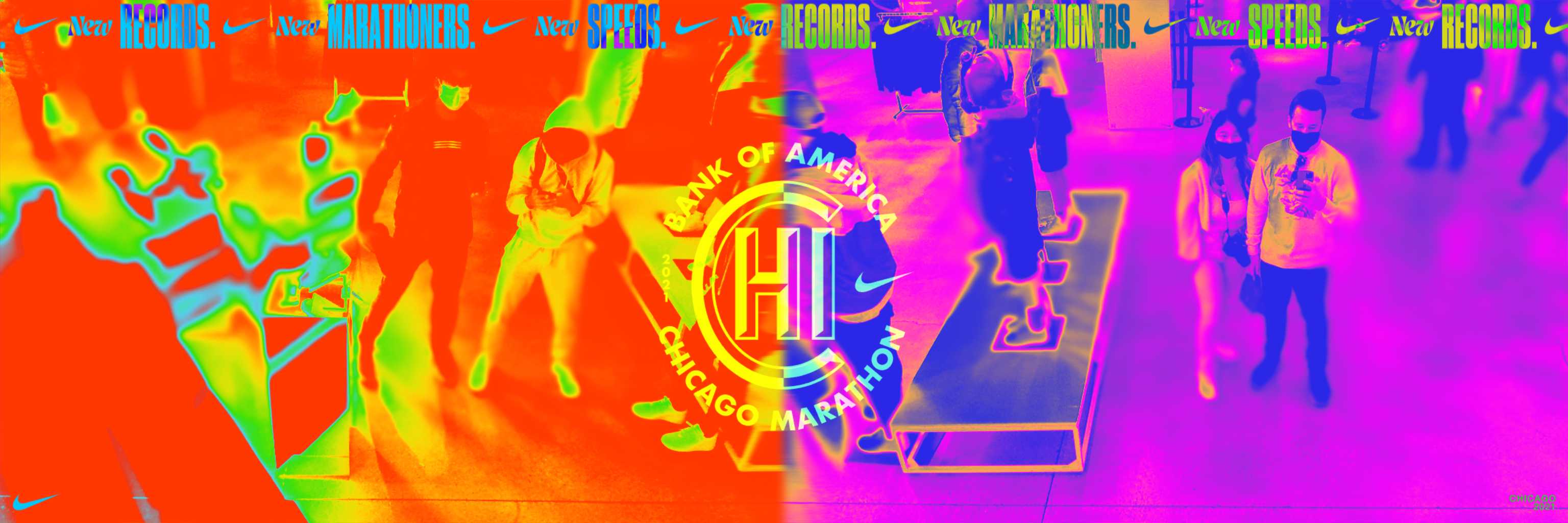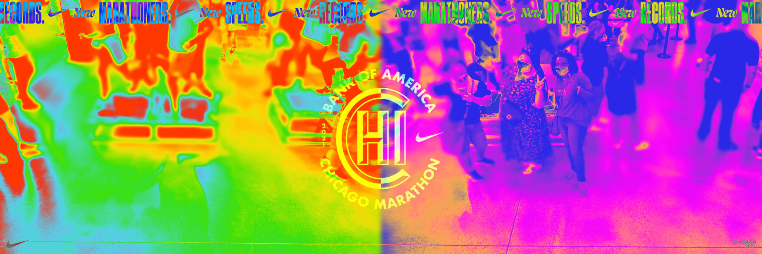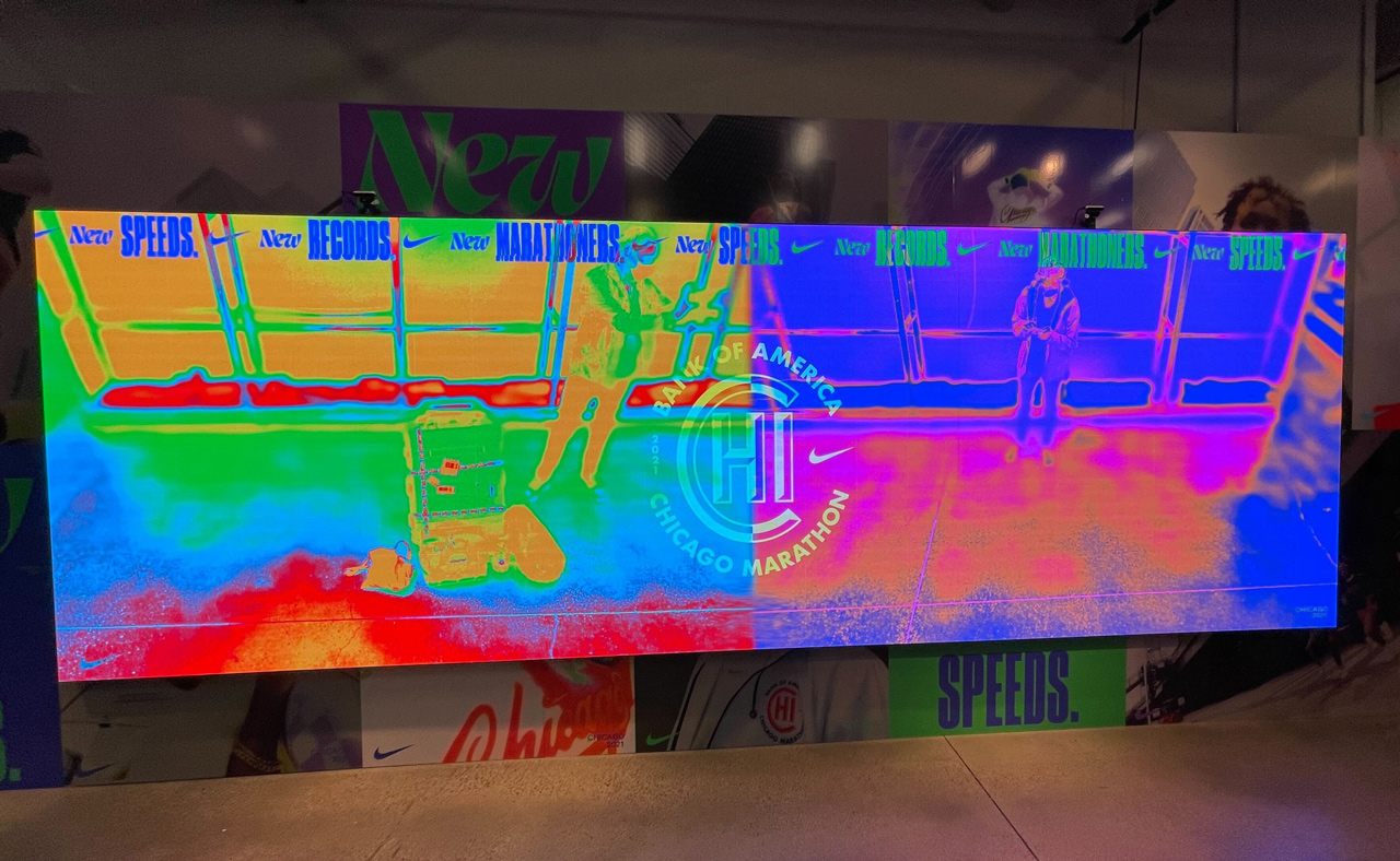 As part of Nike's sposorship of the 2021 Chicago Marathon, their flagship store mixed the festivities with their "Play New" campaign. Hovercraft Studio had me develop the software behind a dual-purpose interactive screen. The extra-wide custom LED array transitioned between a "Play New" campaign video loop and an interactive camera experience. The camera portion mixed the campaign colors with a real-time video feed of visitors via custom shaders. The camera depth feed was used by the shader effects to blur the background and give more visual focus to the visitors. The result was an integrated, branded moment for selfies, and a celebration of the historic marathon's return to Chicago.