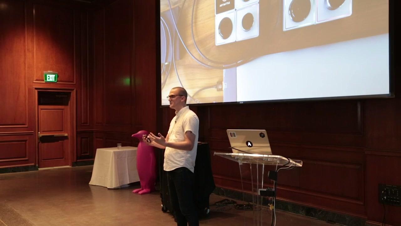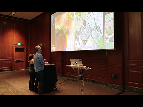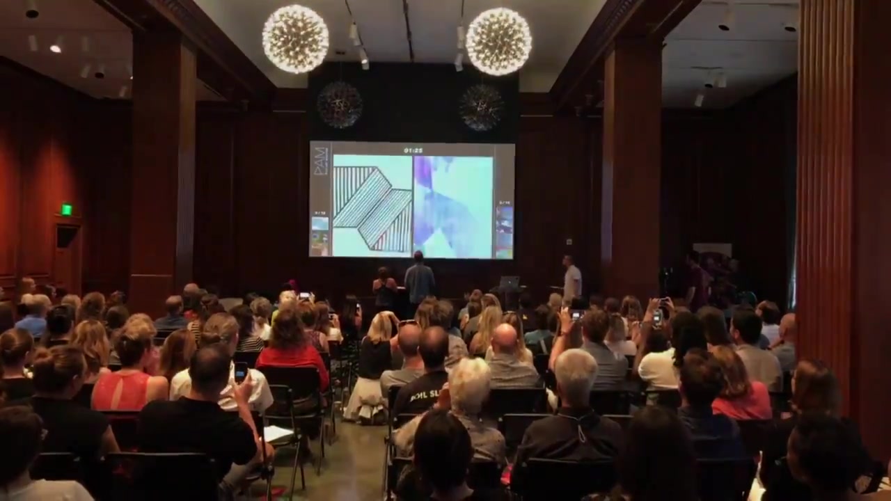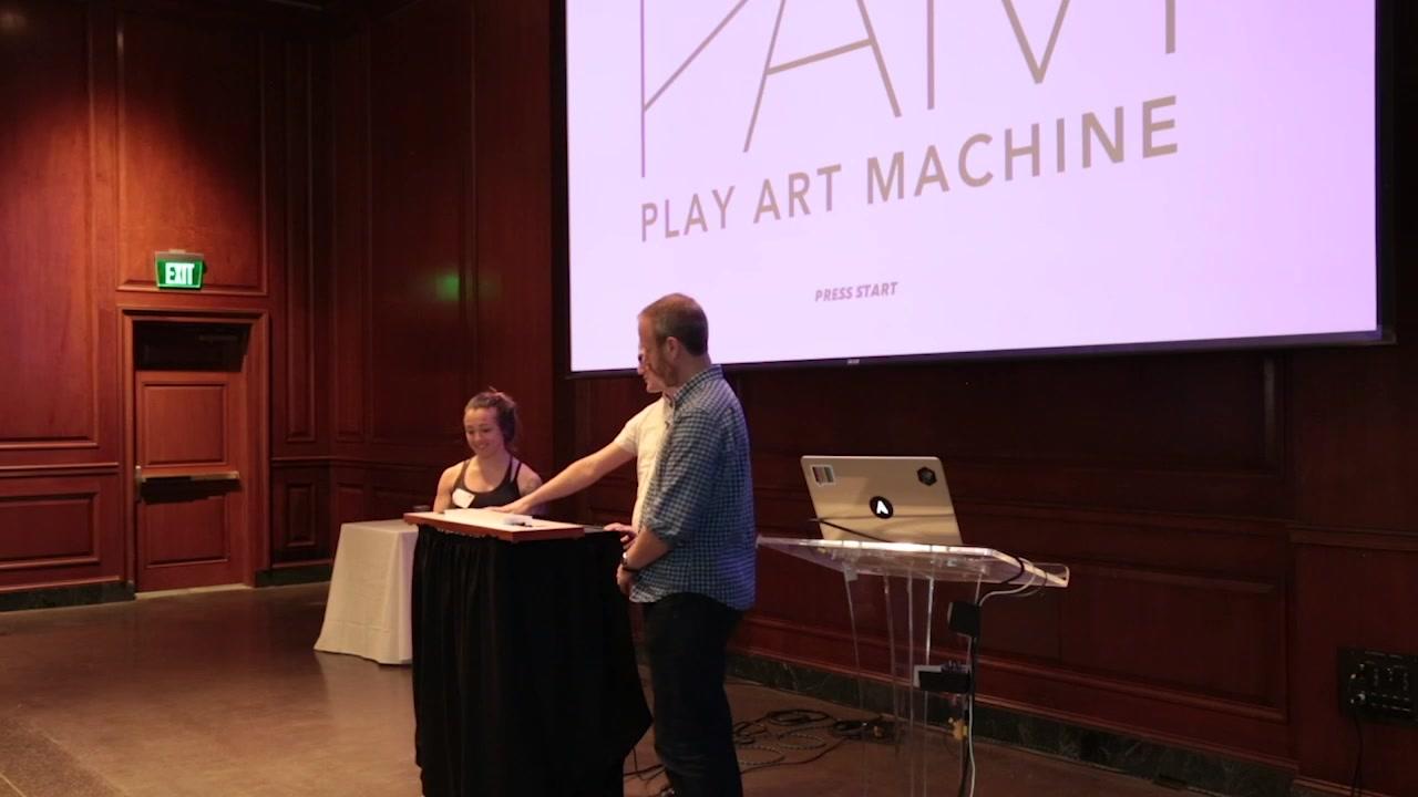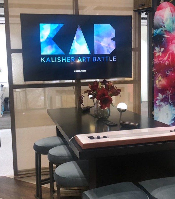 Originally named "Play Art Machine", Kalisher Art Battle (or KAB) is an initiative by Kalisher's President, David Winton, to demystify and democratize the art-making process. KAB is a 1 or 2 player game that uses simple arcade-style buttons to quickly make art by remixing a huge library of source material. Button 1 loads a random image, while button 2 removes a layer. The most expressive control, a knob, allows players to change blend modes for each layer, allowing for near-infinite compositing and remixing. KAB has been shown at Creative Mornings, Raleigh and BDNY in August and November, 2018. The battle from Creative Mornings starts at around 15:16 in the video above, and can be seen from a different angle below, via Twitter.