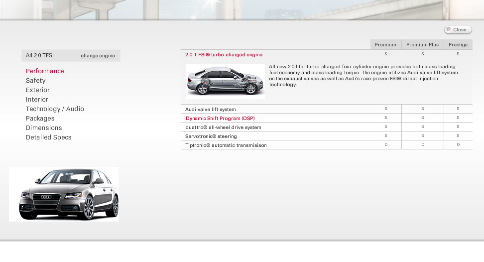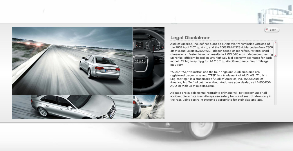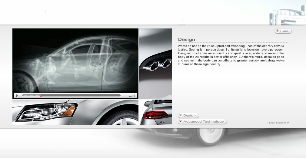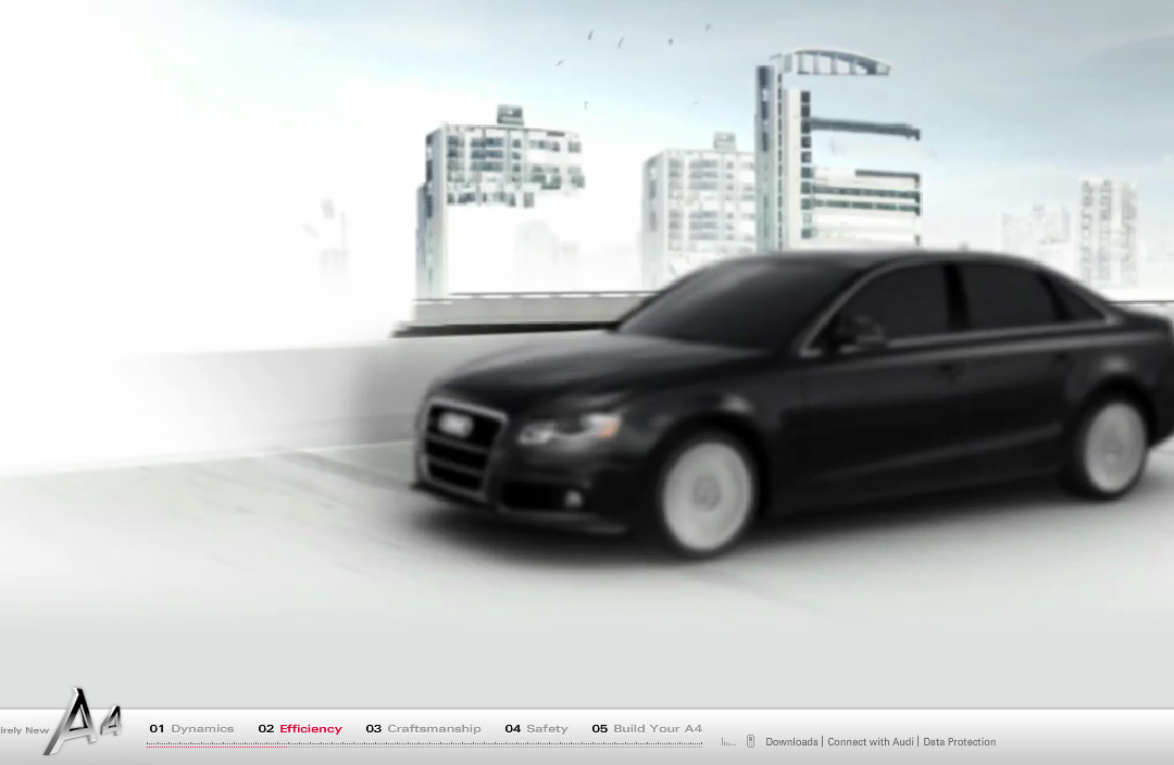 Audi rolled out the new A4, and we handled the web side of things. Big team effort on this site by coders Grant, Ryan and myself. Slick design by Bryan C, Ross M, and video by Kris H. I wrote the animation engine for each section, implemented audio, and coded the detail & legal screens and fancy buttons. Main programming by Grant, and configurator and spec sections by Ryan. Originally posted at http://www.truthinengineering.com/a4